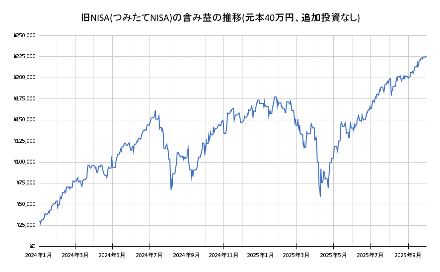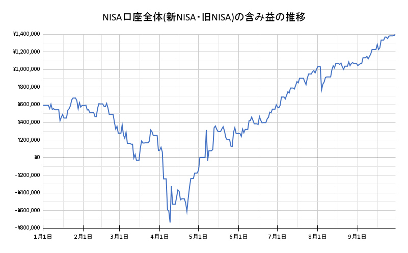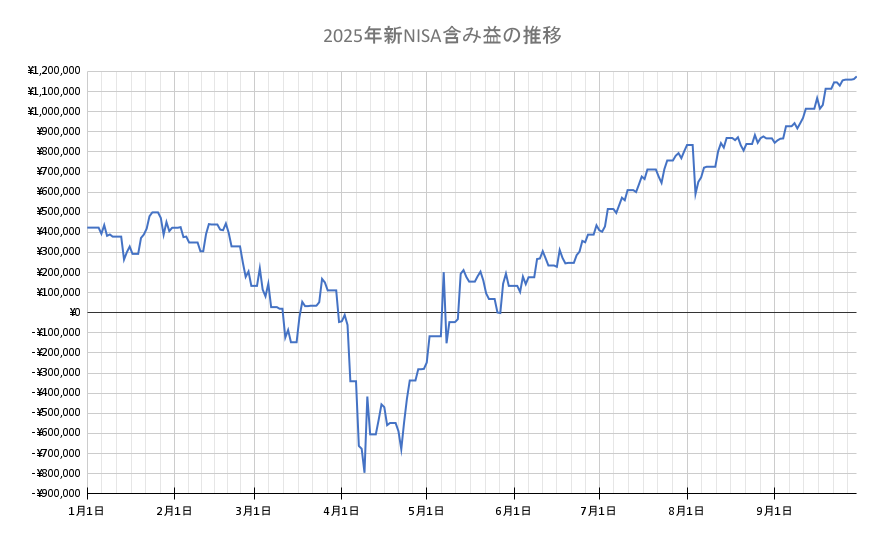 年初からの2025年の新NISAの含み益の推移が下のグラフになります。