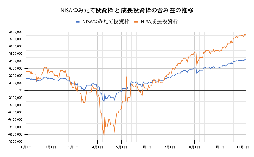 下は、年初1月からのNISAつみたて投資枠と成長投資枠の含み益の推移のグラフになります。