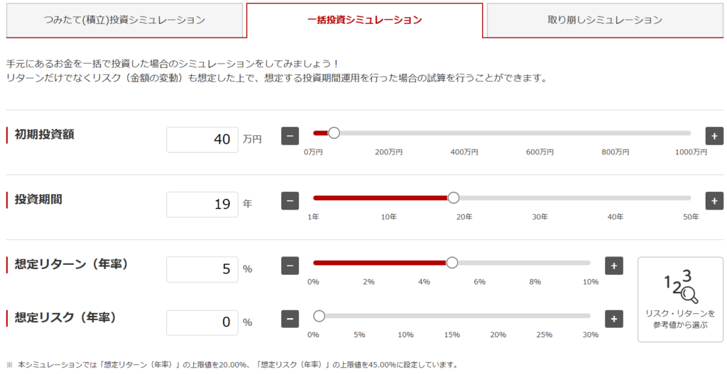 三菱UFJアセットマネジメントの一括投資シミュレーションで40万円を年利5%運用でシミュレーションすると