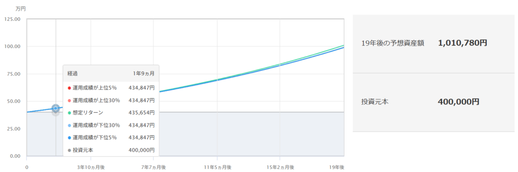 5%で運用した場合の1年9ヶ月時点の想定リターンが435,654円になります。