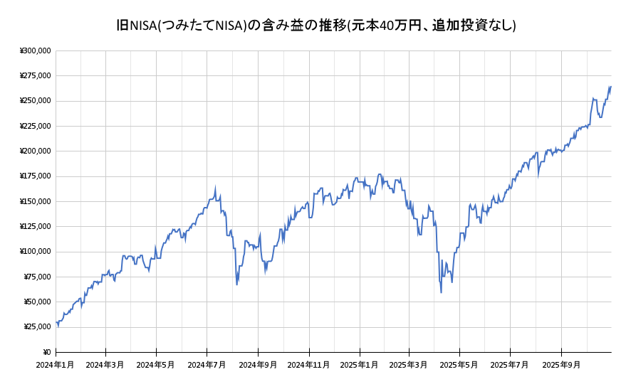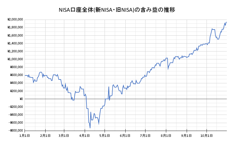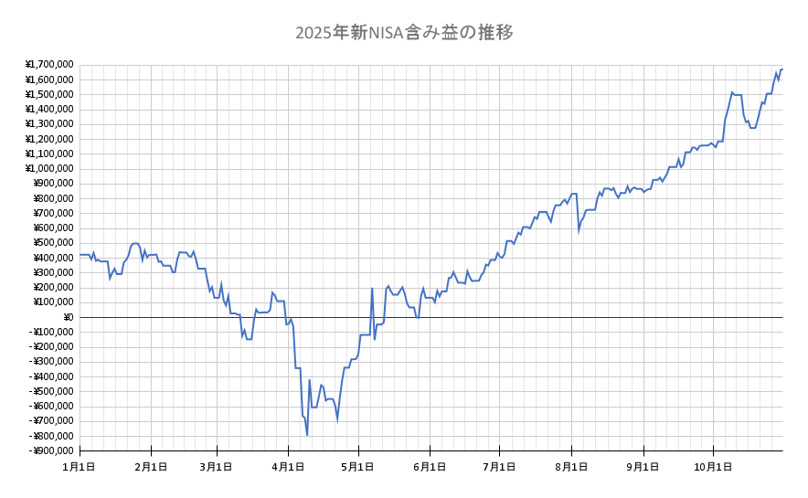 年初からの2025年の新NISAの含み益の推移が下のグラフになります。