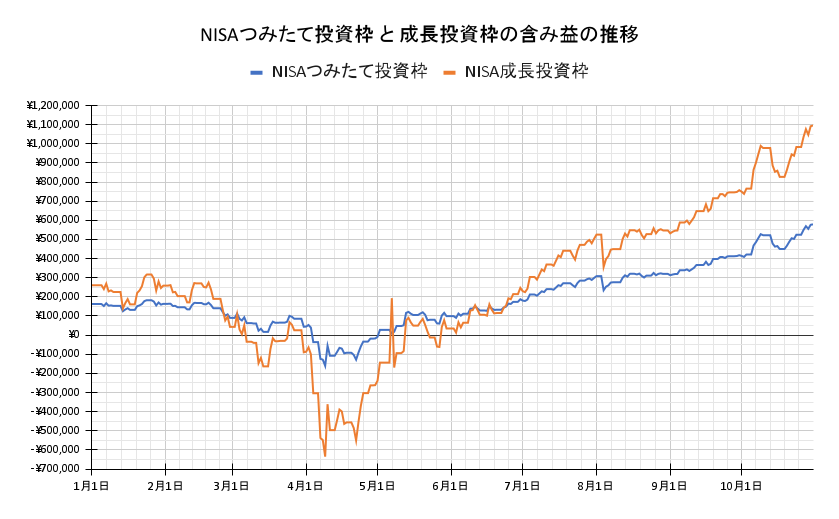 下は、年初1月からのNISAつみたて投資枠と成長投資枠の含み益の推移のグラフになります。