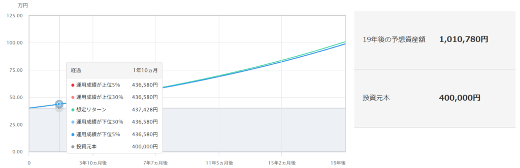 5%で運用した場合の1年10ヶ月時点の想定リターンが437,428円になります。