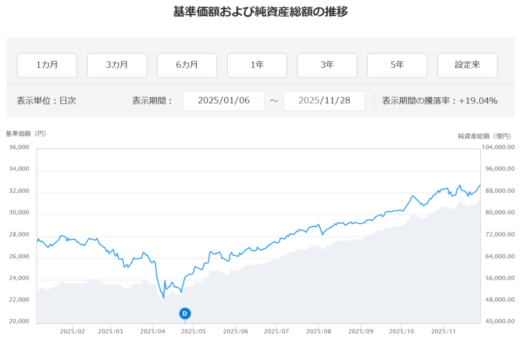 年初から11月末までのオルカンの基準価額および純資産総額の推移が下のグラフになります。
