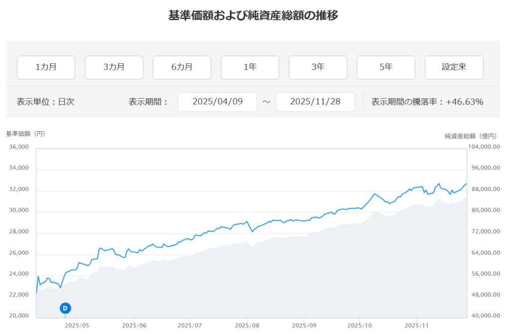 その4月9日の暴落から11月末までのオルカンの基準価額および純資産総額の推移が下のグラフになります。