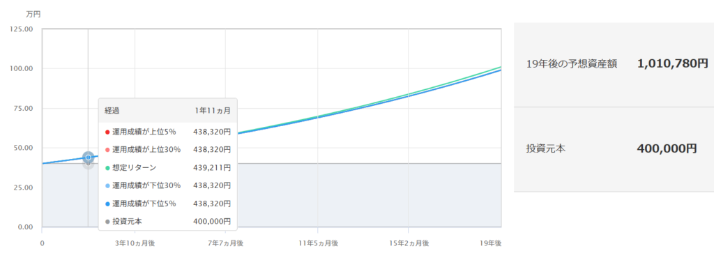 5%で運用した場合の1年11ヶ月時点の想定リターンが439,211円になります。