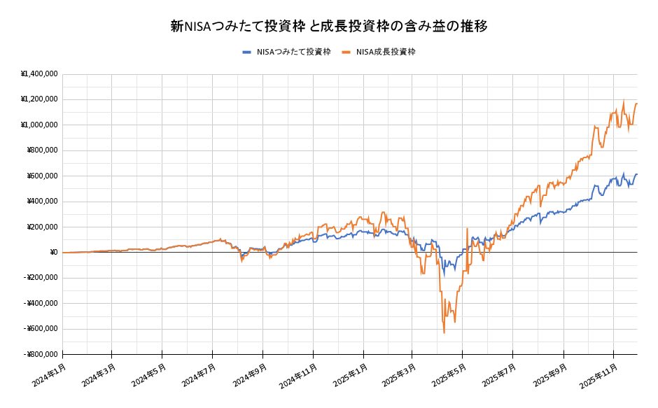 下は、2024年1月からの新NISAつみたて投資枠と成長投資枠の含み益の推移のグラフになります。
