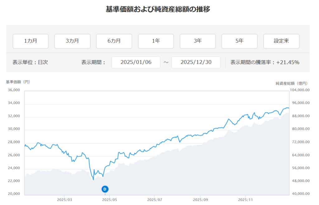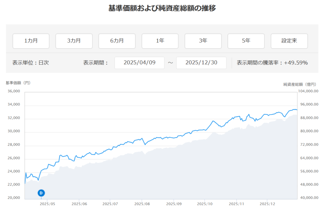 その4月9日の暴落から12月末までのオルカンの基準価額および純資産総額の推移が下のグラフになります。