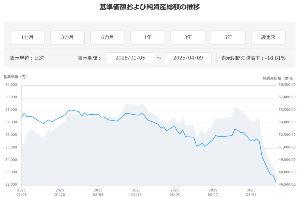 一番暴落した4月9日の年初からのオルカンの基準価額および純資産総額の推移が下のグラフになります。