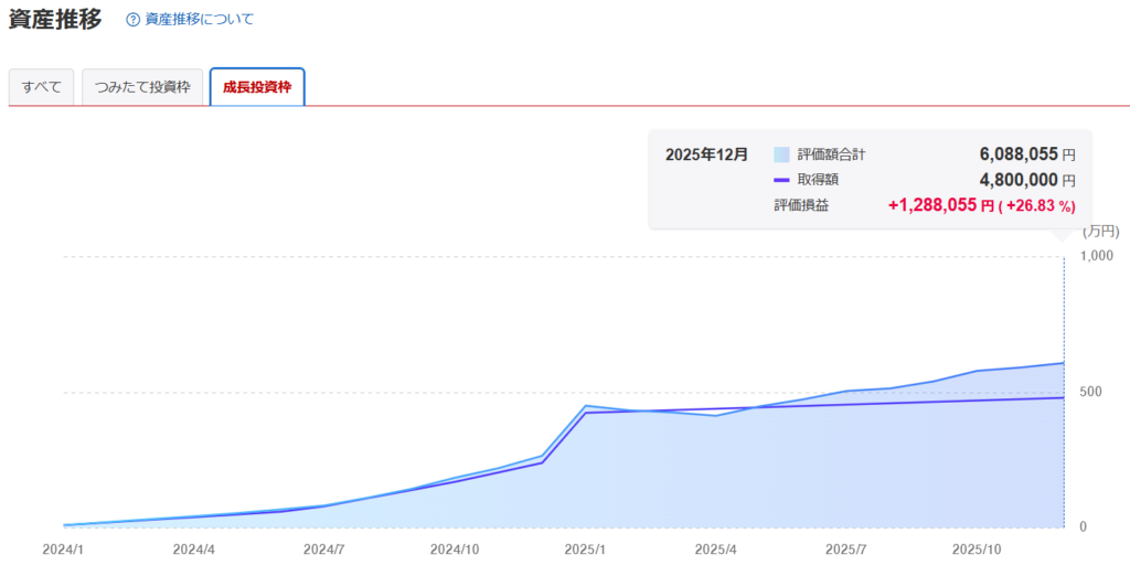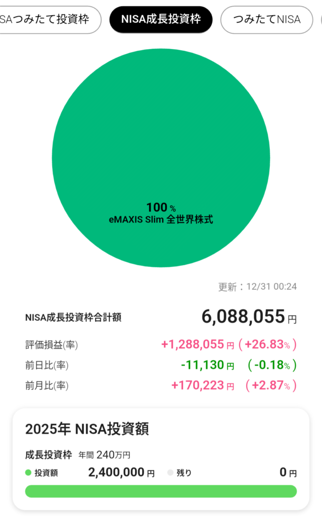 成長投資枠はつみたて投資枠に比べて元本が大きいのと成長投資枠には年初に180万円を一括投資したこともあり、トランプ関税の暴落時のマイナス額が大きくなってます。