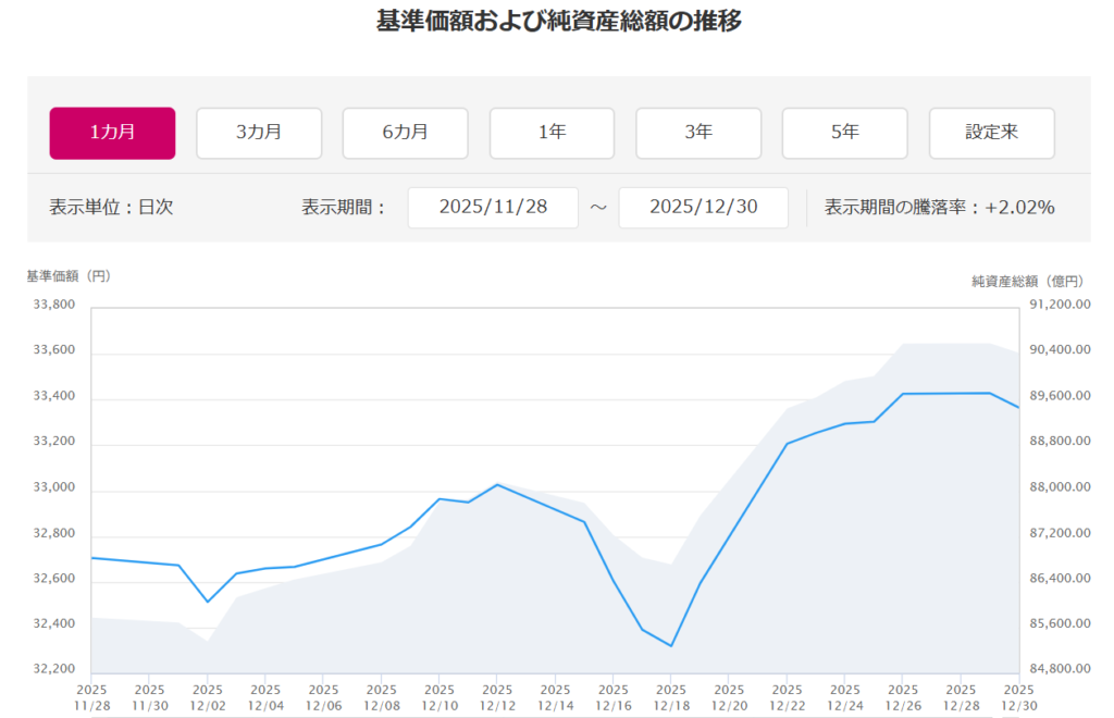 12月のオルカンの基準価額および純資産総額の推移が下のグラフになります。
