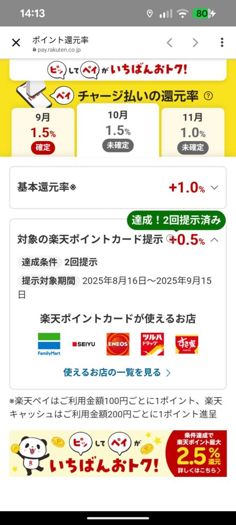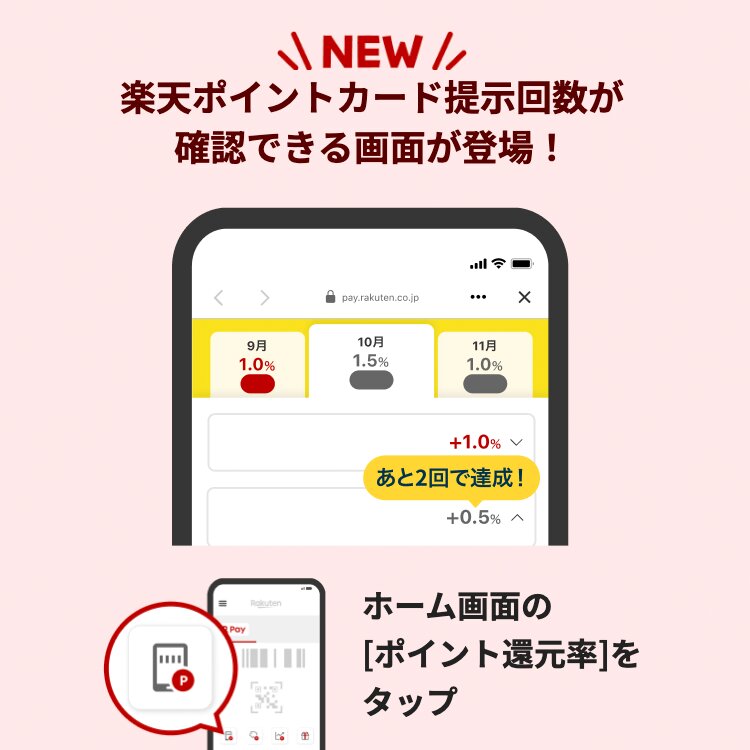 条件を達成できているかの確認は楽天Payアプリの中の「ポイント還元率」をタップすると確認できます。