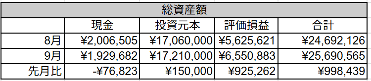 株価が好調だった9月に大幅に評価額が増えました。