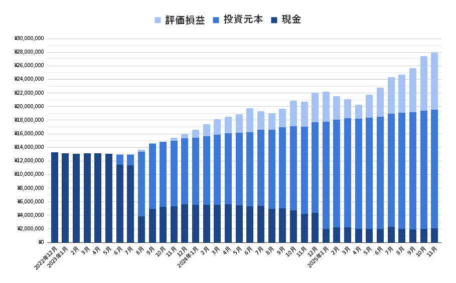 2022年12月の総資産額が約1300万円だったのが約3年で2800万円近くまできました。3年で約1500万円、年平均で約500万円資産が増えていることになります。