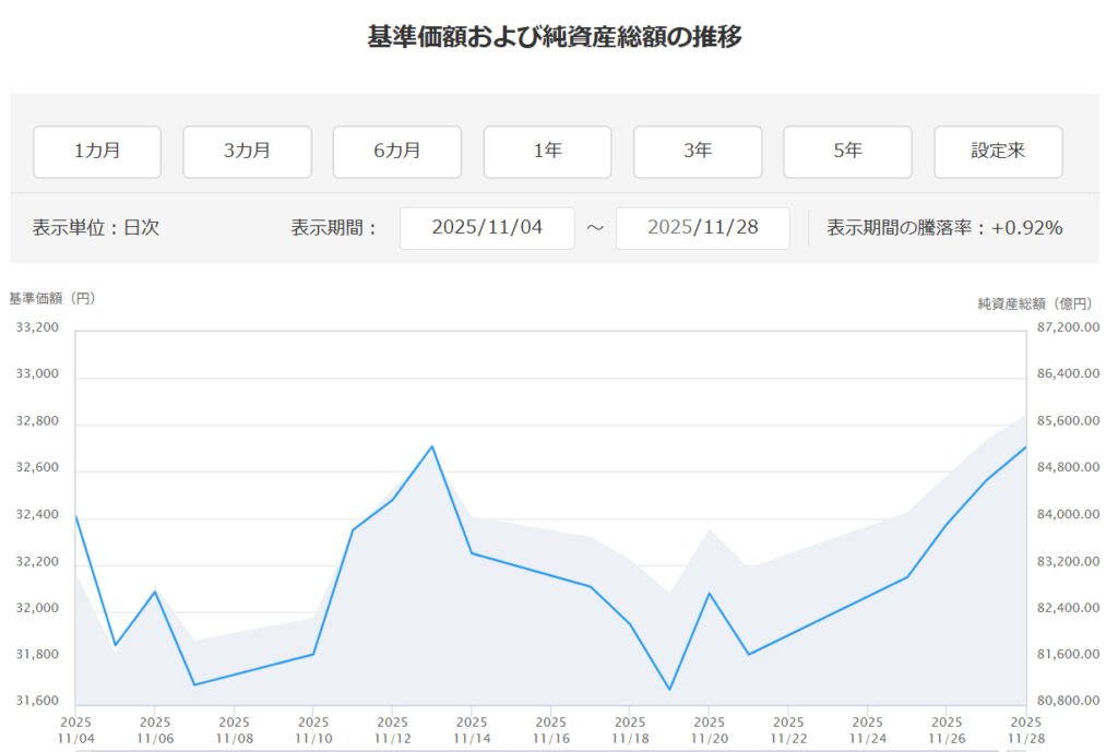 下はオルカンの11月の基準価額および純資産総額の推移になります。
