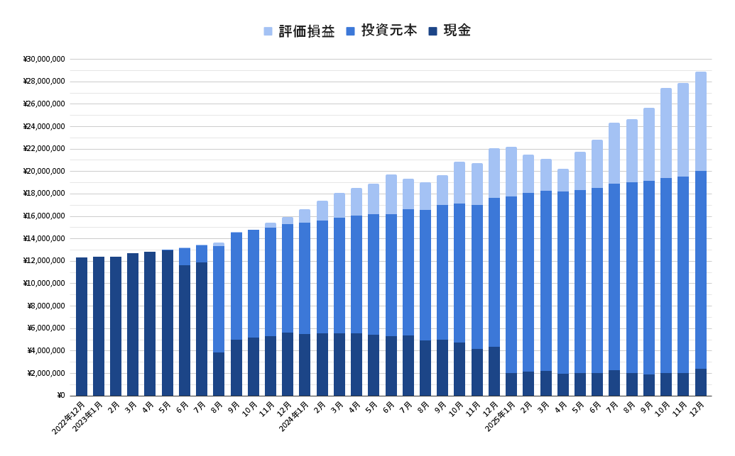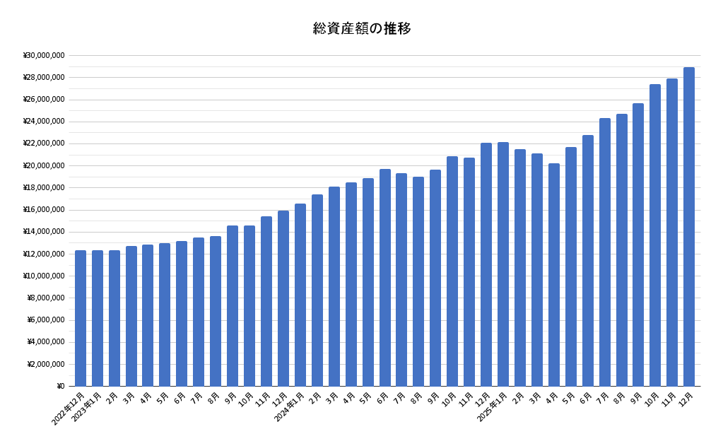 2022年12月の総資産額が約1200万円だったのが3年で2900万円近くまできました。