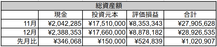 2024年12月末の総資産額が22,060,975円の約2200万円でした。