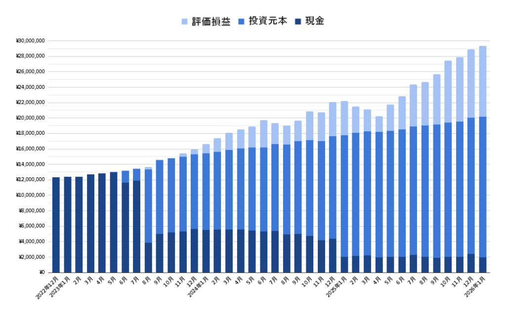 2022年12月の総資産額が約1200万円だったのが3年ほどで2900万円を超えてきました。
