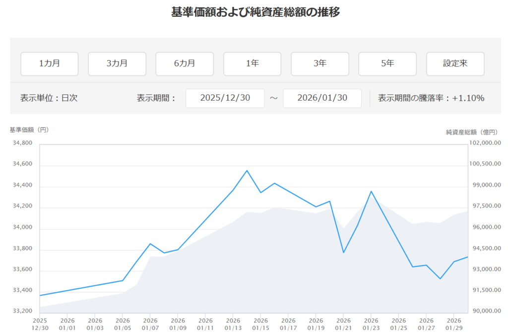 下はオルカンの1月の基準価額および純資産総額の推移になります。