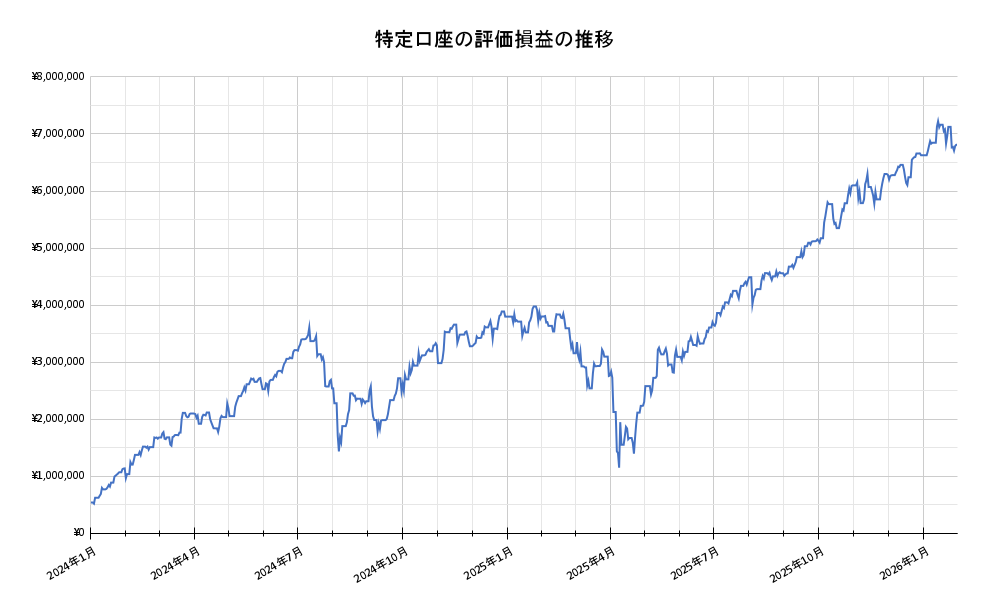 2024年1月からの特定口座の評価損益の推移が下のグラフになります。