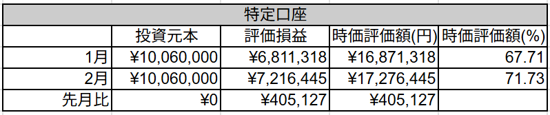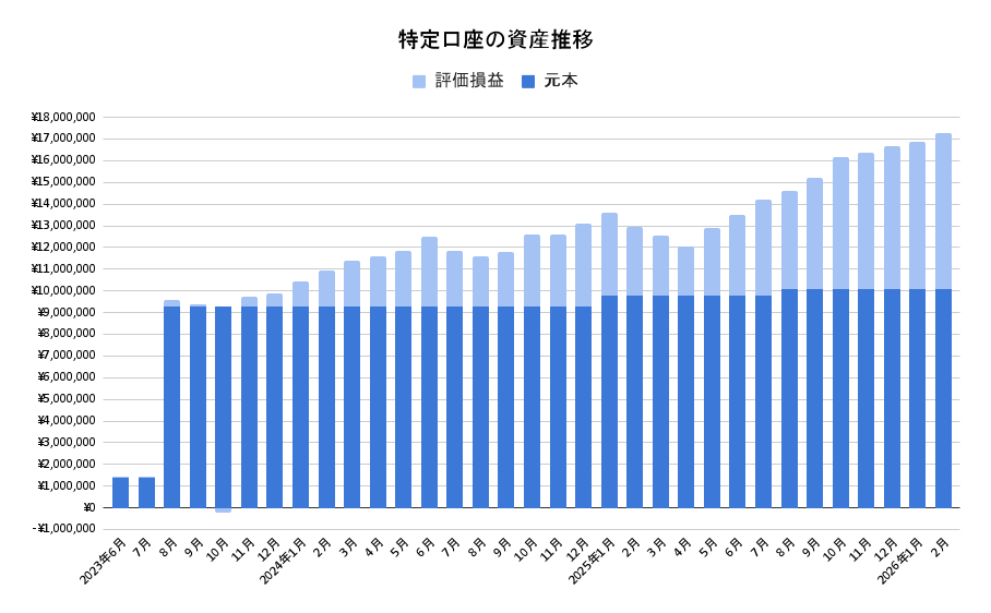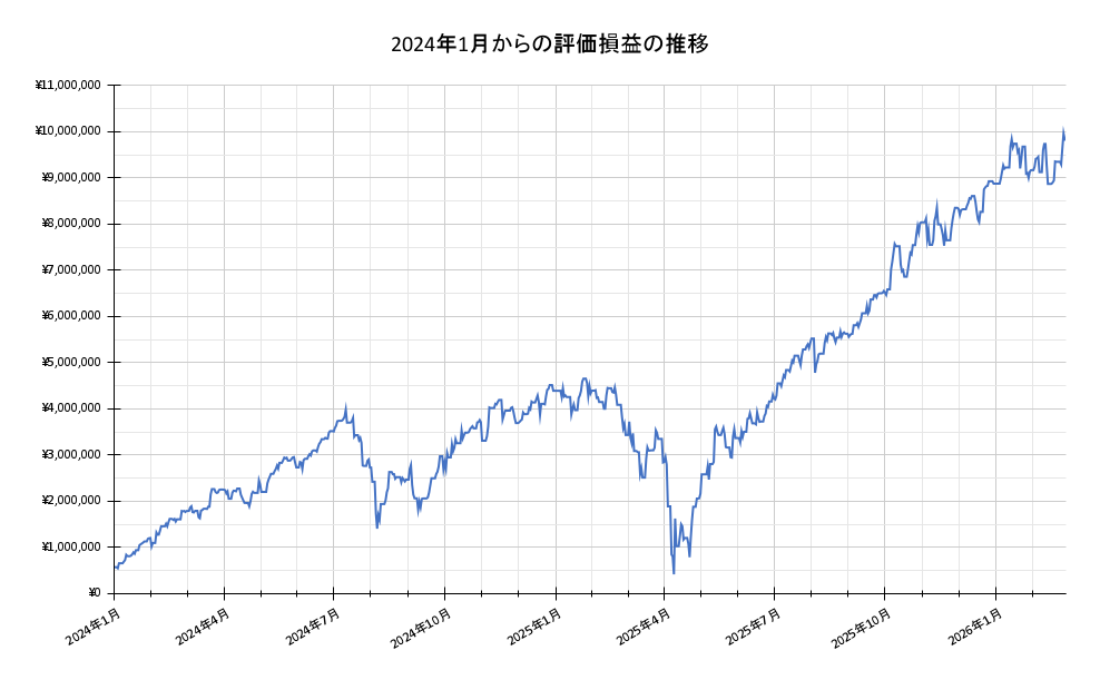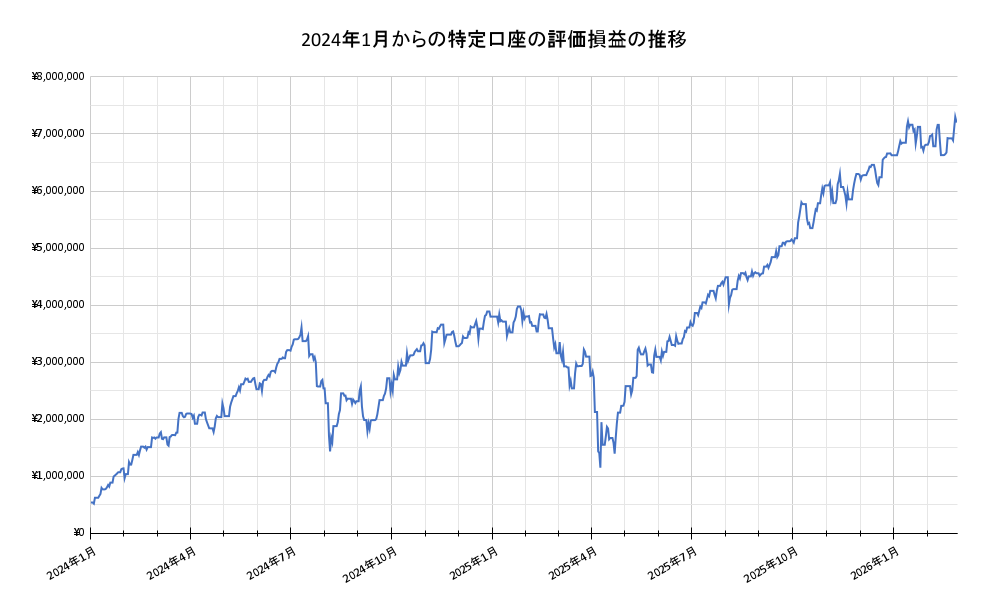 2024年1月の評価損益が53万円ほどだったのが2026年2月末には721万円にまでなっています。