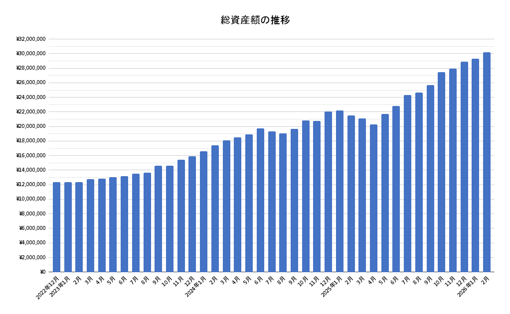 2022年12月の総資産額が約1200万円だったのが、3年と2ヶ月で3000万円を超えてきました。