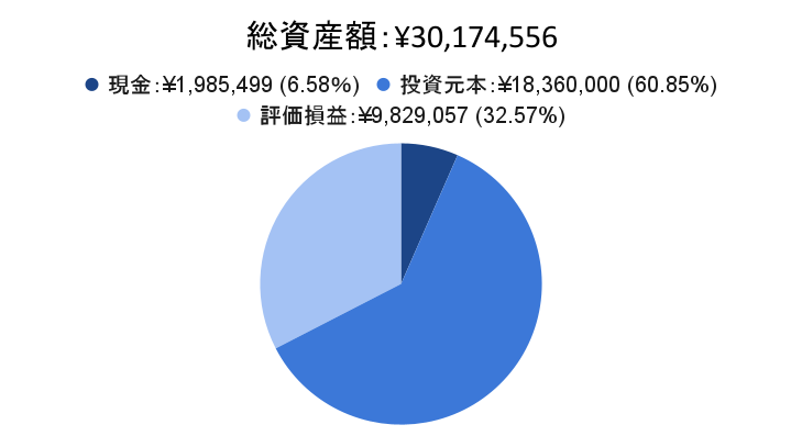 総資産額に占める現金と投資元本、評価損益の比率が下のグラフになります。