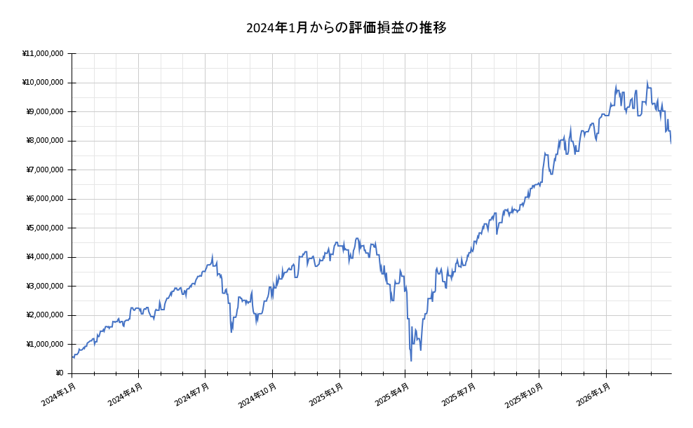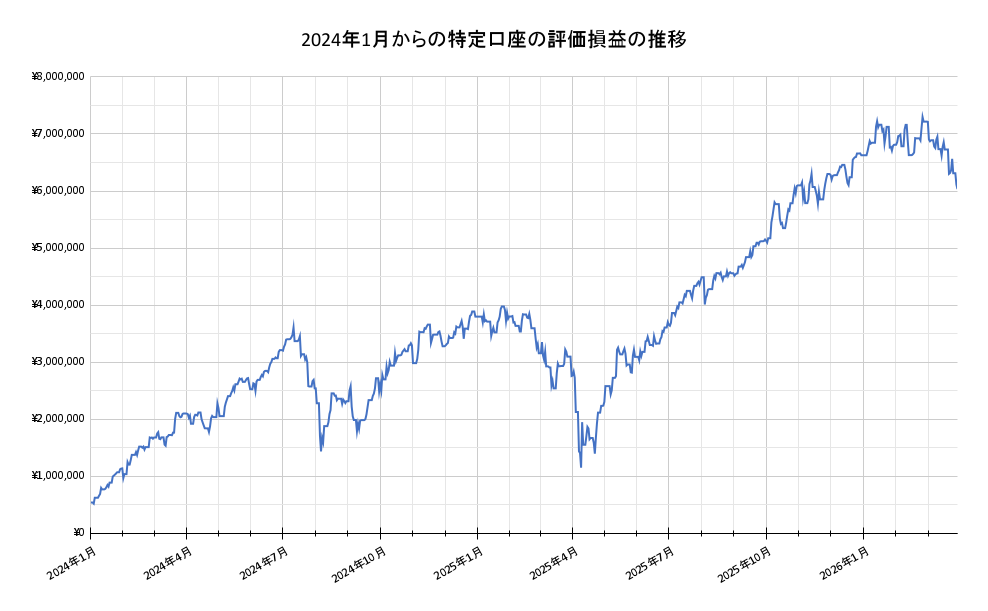 2024年1月の評価損益が53万円ほどだったのが2026年3月末には600万円にまでなっています。