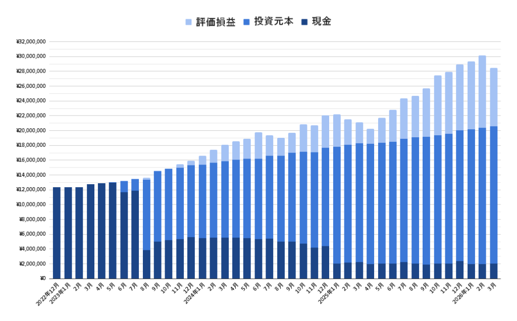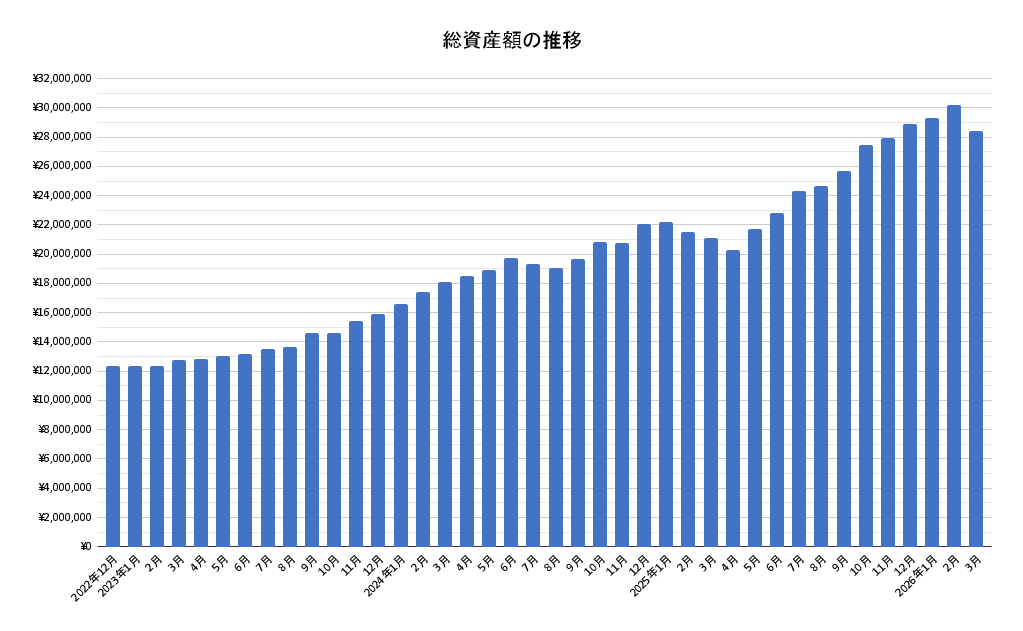2022年12月の総資産額が約1200万円だったのが、3年と3ヶ月で2800万円を超えてきました。