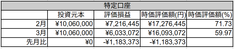 2月末の時価評価額17,276,445円 x -6.85% = -1,183,436円
